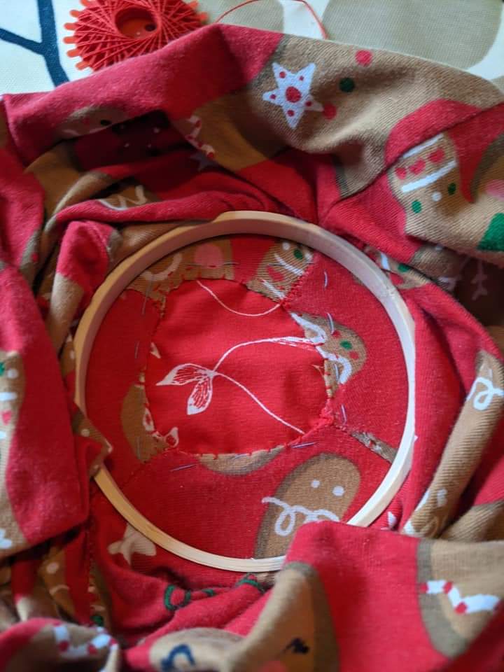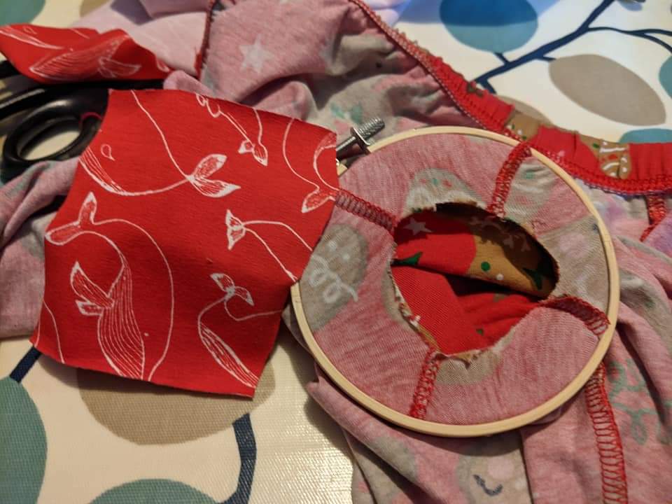 - Using either an embroidery hoop to keep shape, or the leggings can be laid out flat, being careful to not flatten out the fabric so you don’t sew through two bits.