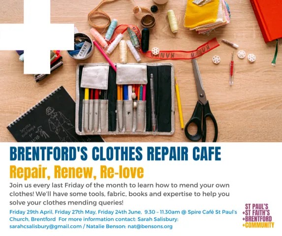 The Brentford Clothes Repair cafe meets once a month Friday of the month at Spire Café at St Paul’s Church, St Paul’s Road, Brentford TW8 0PN, from 9.30-11.30 am.