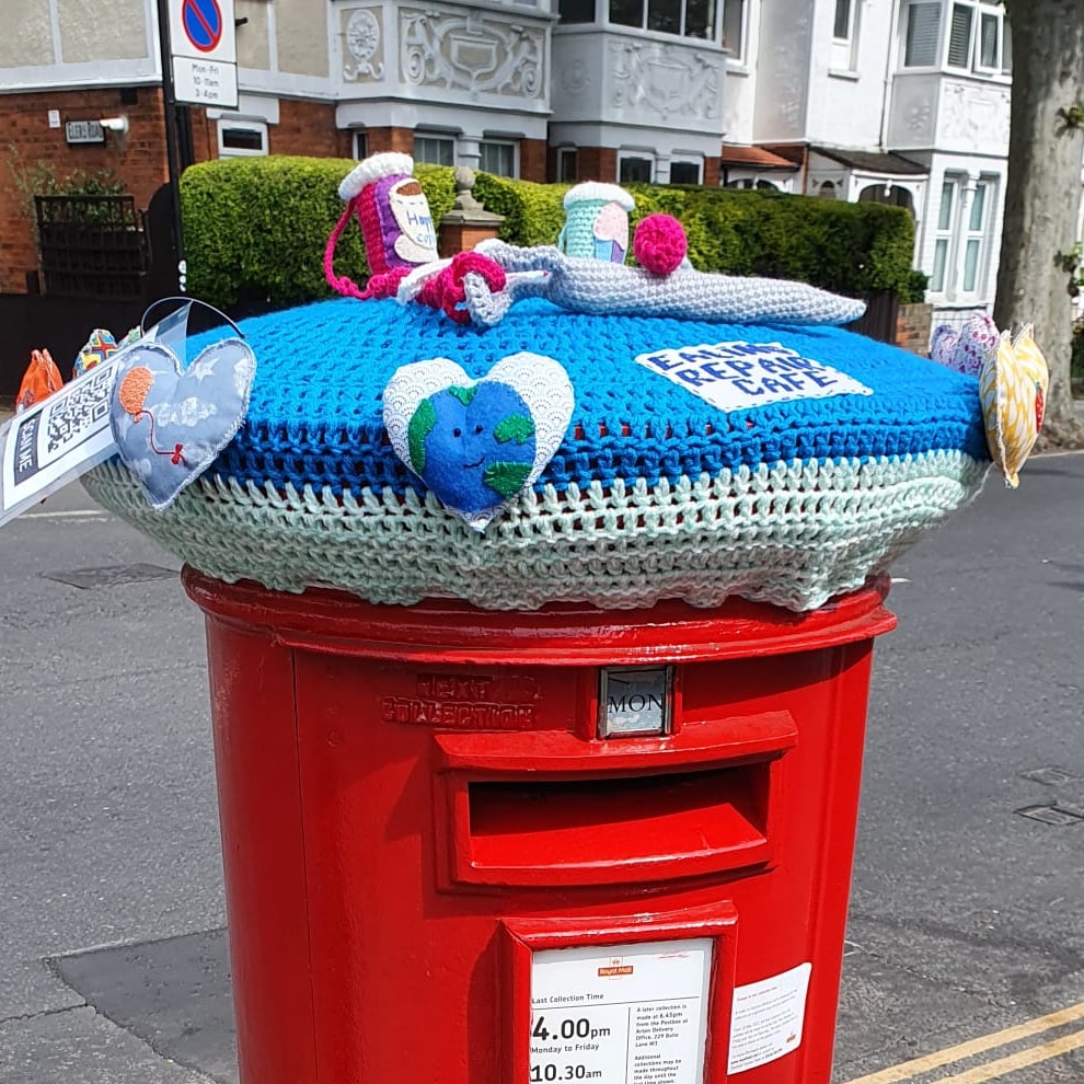 Ealing repair cafe made this postbox topper along Northfields Avenue, opposite Elers Road to promote us and also give people inspiration for mending their clothes. We thank everyone who has noticed it and promoted us. Makes all the effort put into it worthwhile.