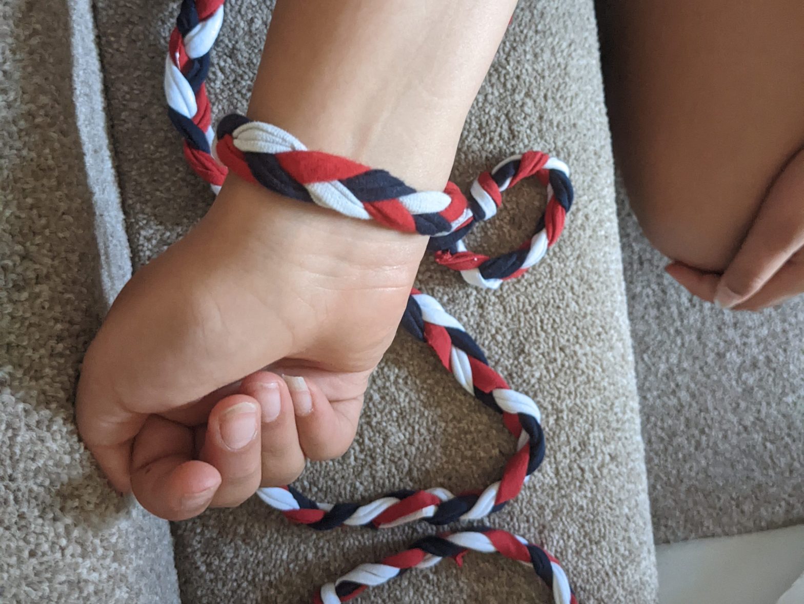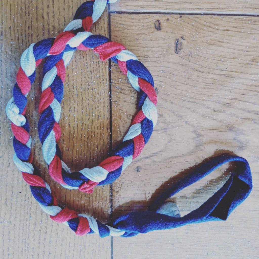 For the Queens Jubilee, my children wanted something to wear to their school celebrations. So I decided to make some headbands and bracelets in red, white and blue by plaiting t-shirt. This is an easy activity to do with children and they love that they have made the bracelet themselves.