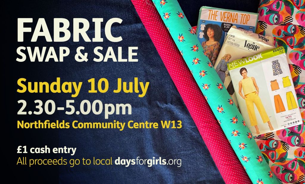 Come along and get some fabric at Days for Girls swap and sale on Sunday 10 July from 2.30 until 5.00 pm, at Northfields Community Centre, Ealing. Bring as much or as little fabric you want to swap.