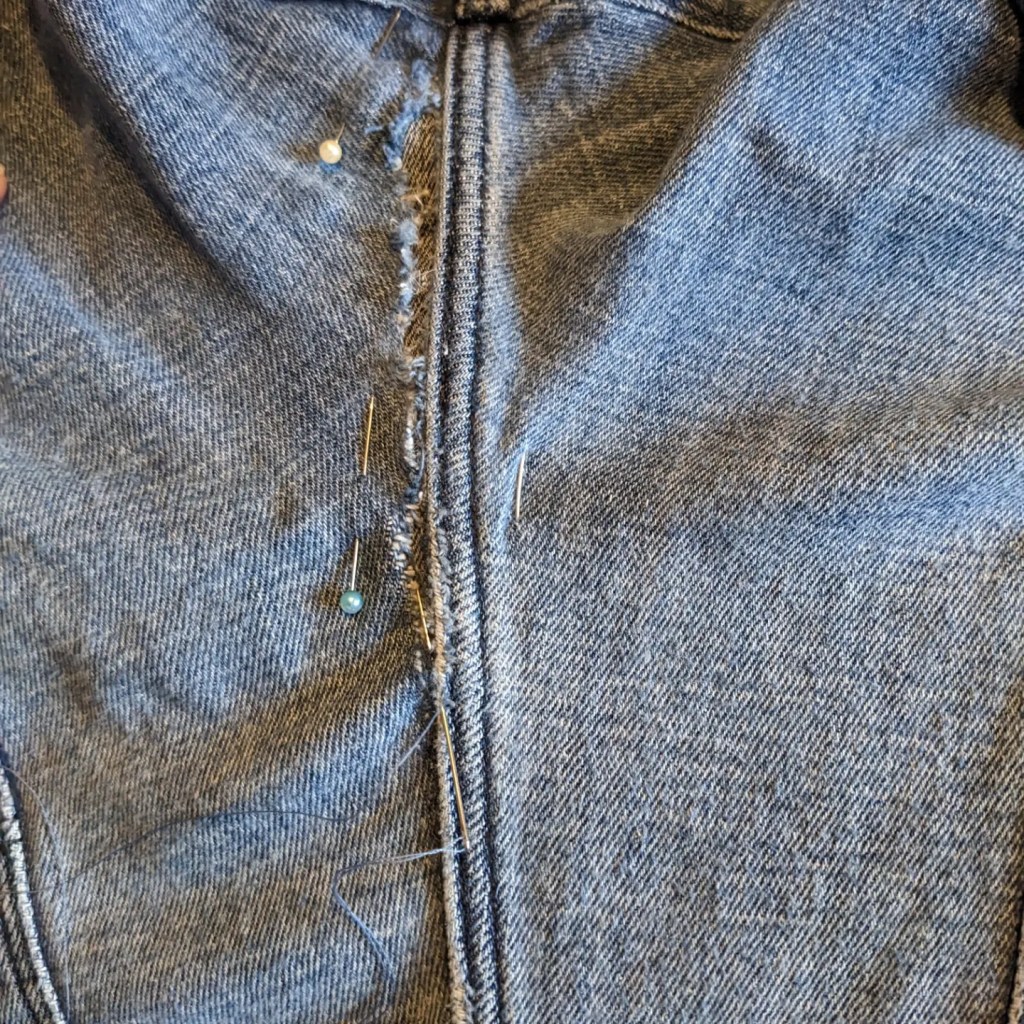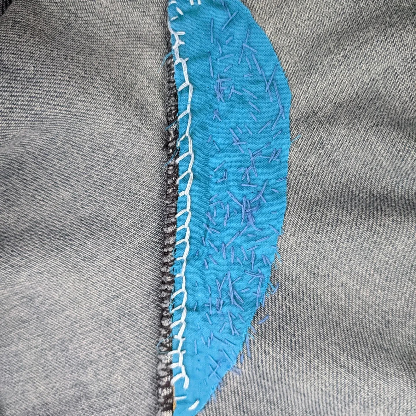 For outside patches you can use sashiko patching and stitching. For these patches I used a graduated embroidery thread. There’s usually 6 threads and we split it to use 3 threads because the thickness of the jeans. How many threads you use is dependant on the thickness and visibility you want of your stitches. The more thread you use the more likely it will be noticed.