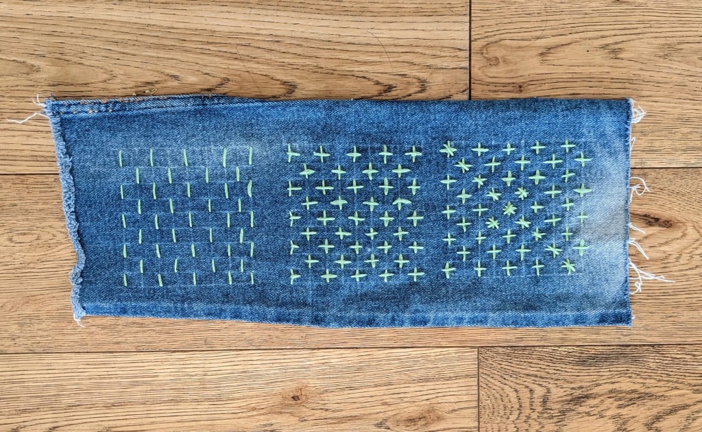 I save the denim from jeans that are beyond repair or offcuts from jeans that have been cut down into shorts to use for patches and practice.