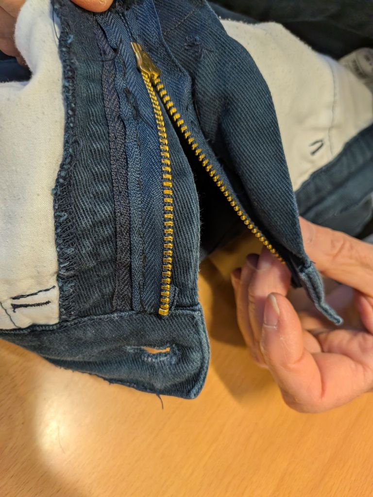 Measure the zip in the trousers and get another one of a similar length. Get a zip that’s joined at one end. For jeans it worth investing in a metal zip as they are hard wearing.