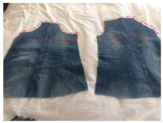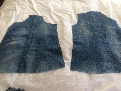 - Finally cut patch pockets from contrast fabric or if you are using the pockets from the jeans unpick them and adjust in size to suit the pinafore.