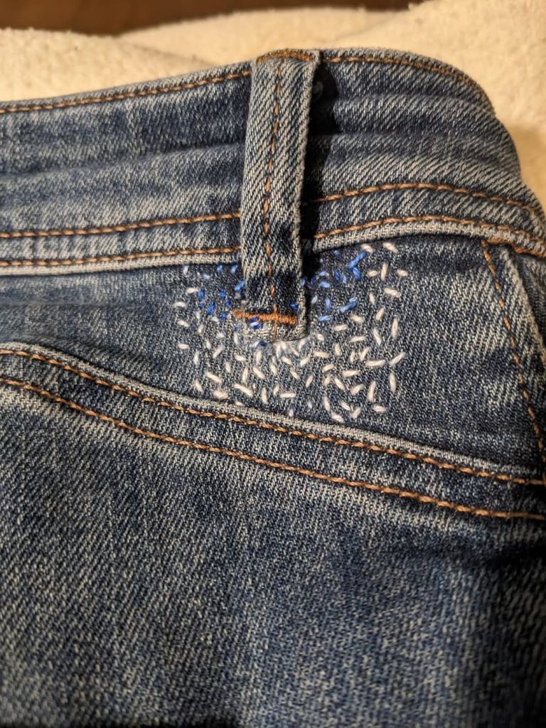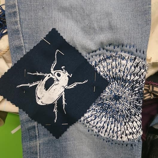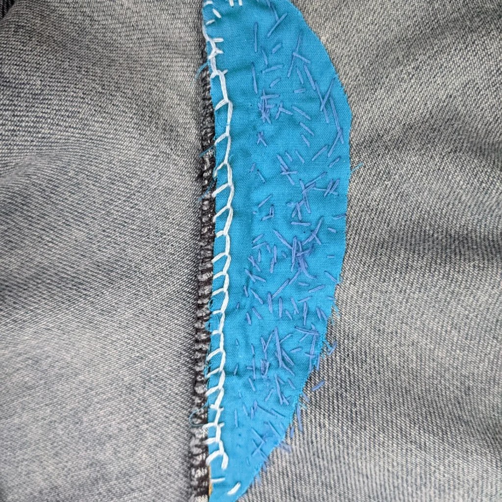 Another popular patching is patching jeans, especially the denim wearing thin on the inside legs. Here we use a less visible mending technique, attaching the patch on the inside and then using either see stitch or running stitch.