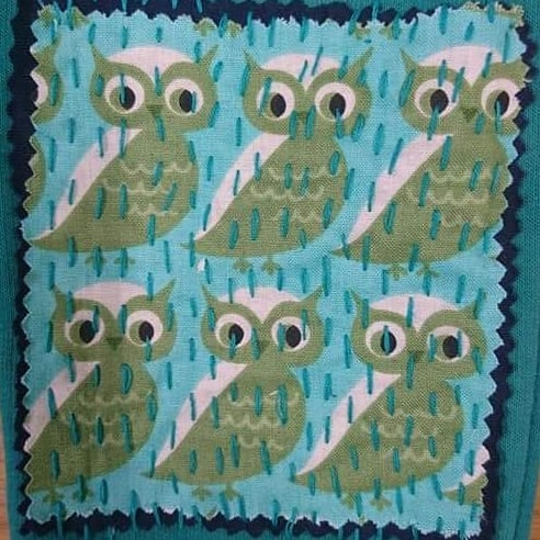 Choose your fabric patch to cover the area. We have a lot of scrap fabric to choose from at our sessions. So take a look at your fabric scraps.