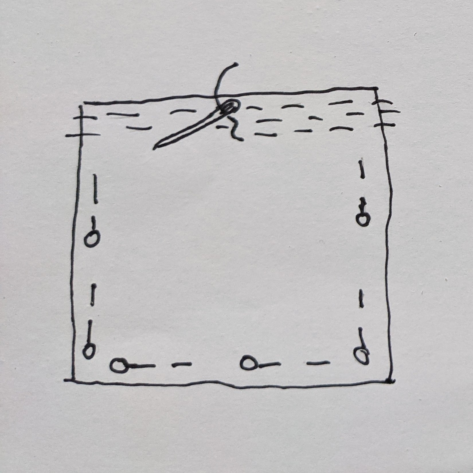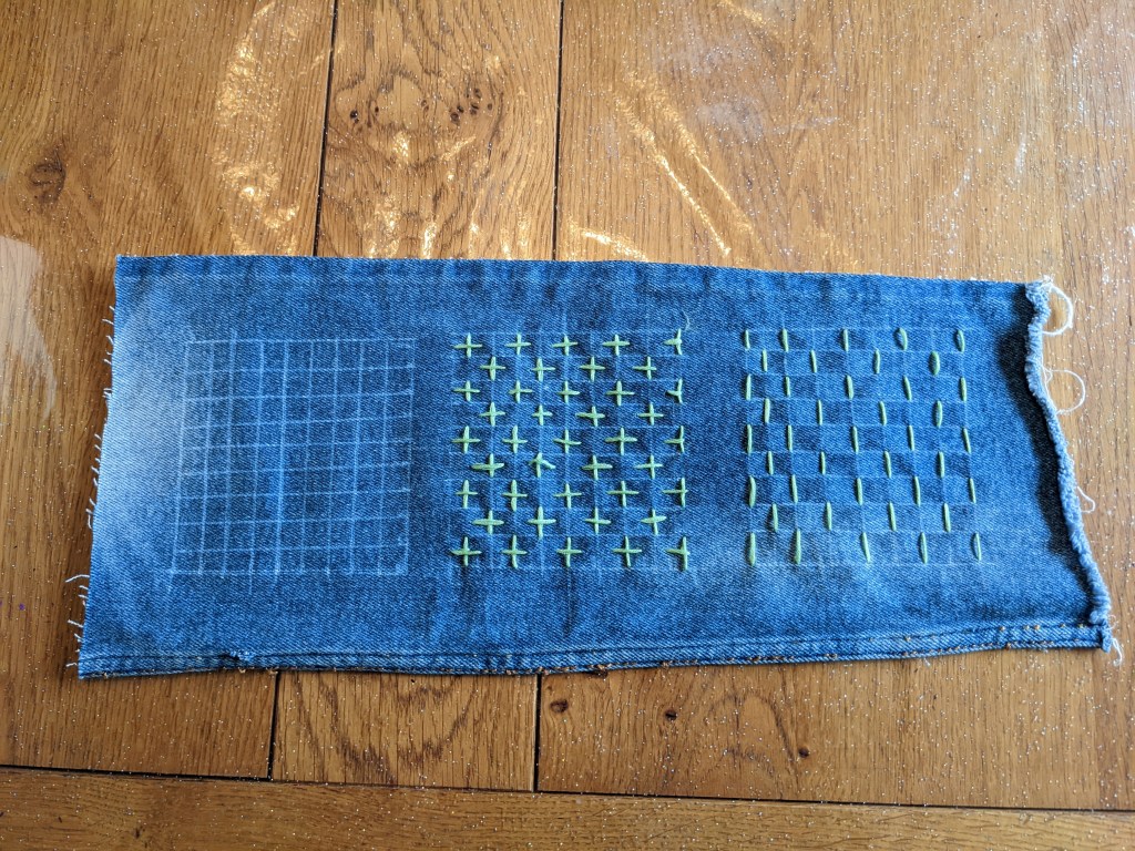 Thread your needle with a length of thread about 30-40cm long, either add a knot at the opposite end to the needle or do two short stitches over each other to secure the thread to patch. Then you can start stitching to secure the patch in place. Here is how to use running stitch or seed stitch.